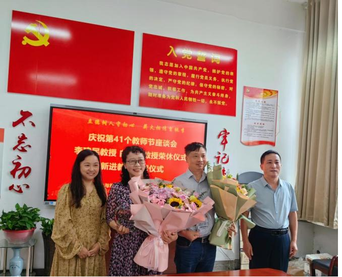 师道相承、薪火相传。魏赛迪、赵果玫两位新进教师给荣休教师李建民、白秀琴献上鲜花,院党委书记张建林、院长王俊俊代表学院赠送了纪念品。